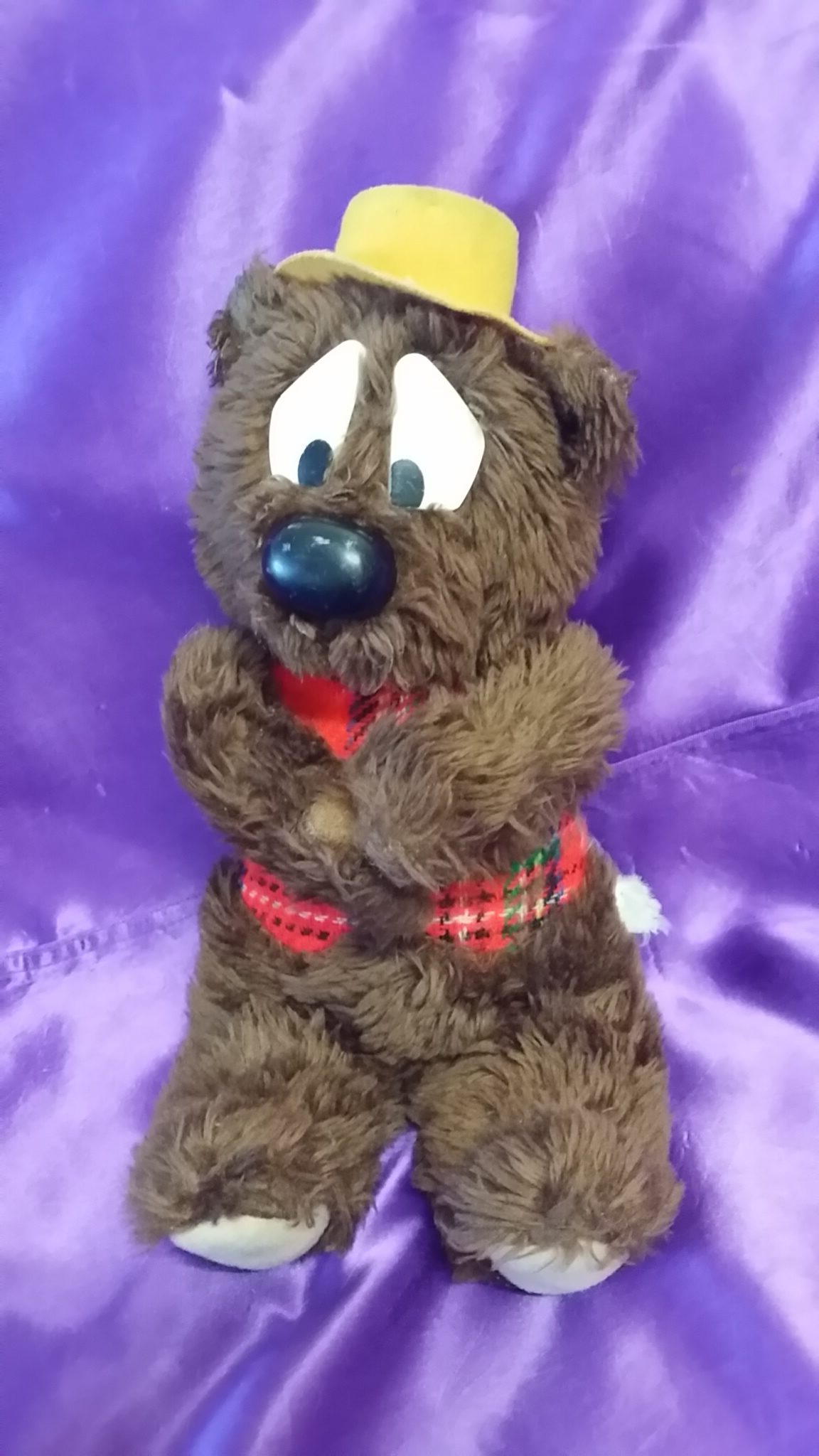 Consequently, the very first Humphrey B Bear soft toys look very similar to Fredd Bear. Made of a dark brown artificial silk plush, Humphrey had short stumpy legs, a bulging pot belly and a large head with small ears. Eyes were made of white vinyl with black plastic button ‘pupils’, whilst the nose was very large and black plastic. He wore a plastic yellow ‘boater’ hat, and tartan fabric (removable) waistcoat/vest. Difficult to find, these original Humphries are usually naked! Stuffing was crumbed rubber, packed firmly, and so, as the toys stood 45cm tall, they were quite heavy.